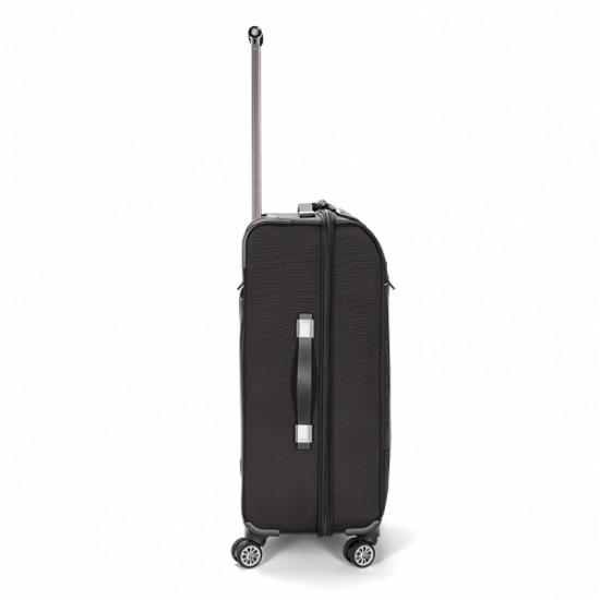 Усиленная задняя панель для максимальной прочности. Алюминиевая телескопическая ручка, снабженная двусторонним кнопочным механизмом фиксации в трёх положениях. Восемь надёжных резиновых колёс гарантируют полную мобильность и комфорт. Чемодан включает в себя чехол для защиты вашей одежды.