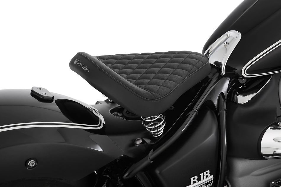 Седло украшено частично нанесенным ромбовидным тиснением шва водонепроницаемого чехла. Эргономичная форма специальной пены разгружает чувствительный к давлению копчик и специально адаптирована к геометрии сиденья BMW R18.